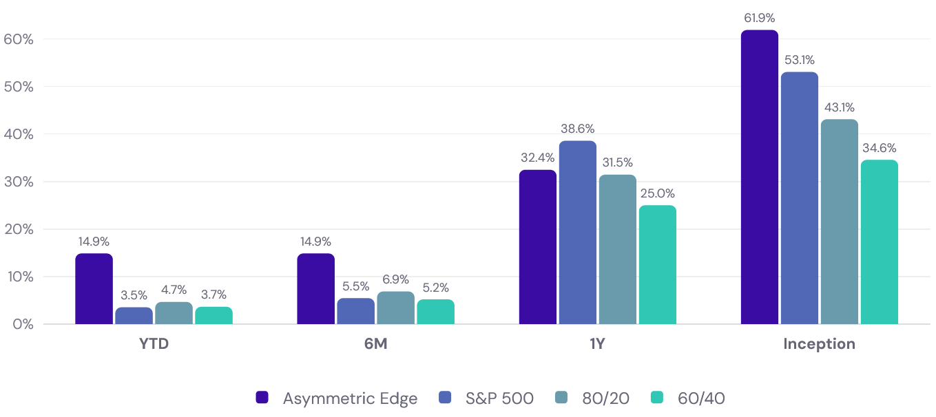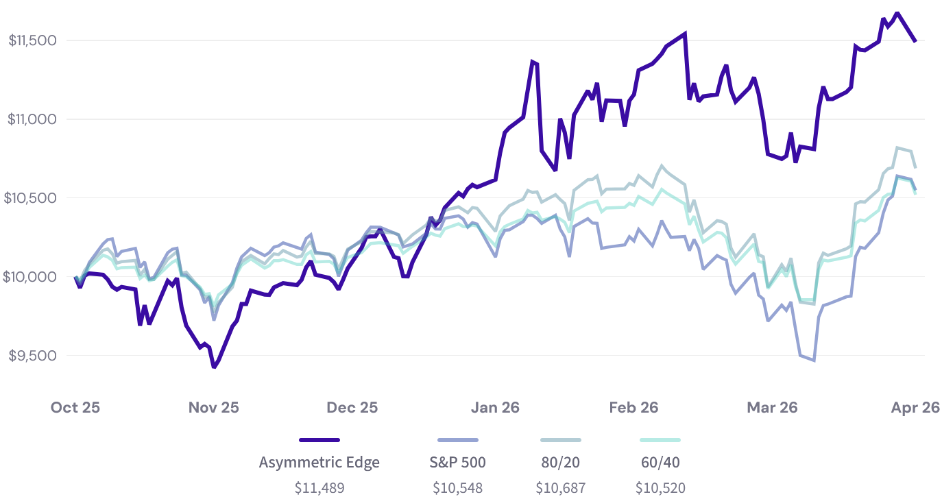 A hypothetical $10,000 invested at the start of the year would have grown to $11,487 in the Asymmetric Edge strategy versus $10,353 in the S&P 500.
