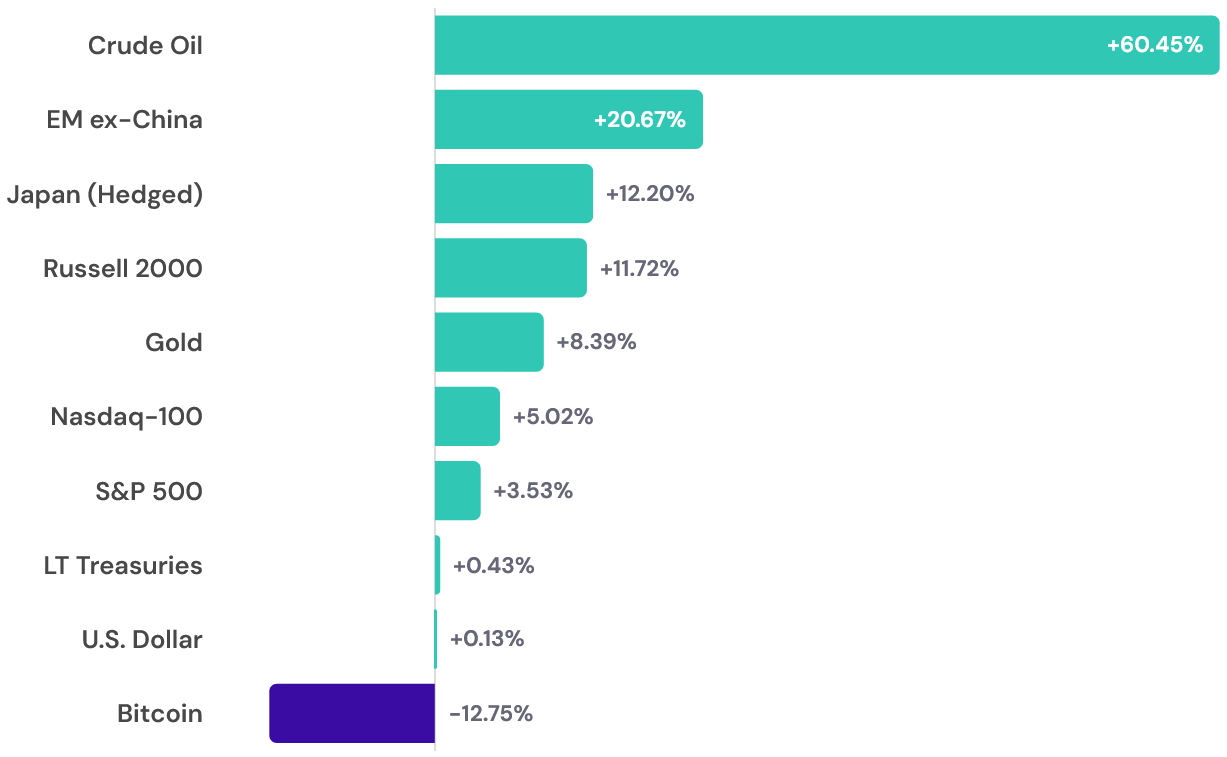 Crude oil leads YTD at +60.45%, followed by emerging markets ex-China (+20.67%), Japan hedged equity (+12.20%), and Russell 2000 (+11.72%). Gold is still positive at +8.39% YTD despite its volatile ride down from January's $5,589 all-time high. International stocks broadly have crushed U.S. stocks this year, with the MSCI ACWI ex-USA index up 9.59% YTD versus 3.56% for the S&P 500. Bitcoin is the year's worst performer on this list at -12.75%.