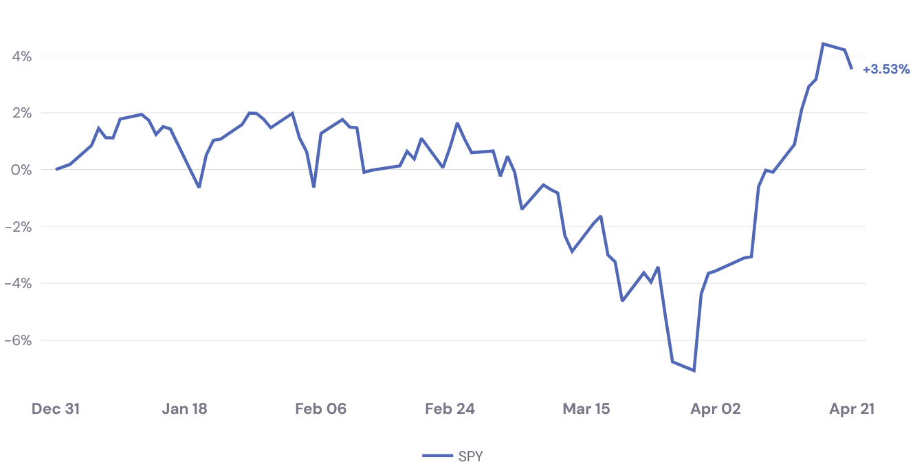 The speed of the U.S. equity comeback has been something to watch. After falling as much as 7% YTD in early April, the S&P 500 roared back to fresh all-time highs above 7,100 by April 17 and the Nasdaq logged its longest winning streak since 1992. The weekend brought a reality check. Iran re-closed the Strait of Hormuz, the U.S. seized an Iranian ship, and the Nasdaq's streak broke Monday. By Tuesday's close, the S&P was back to +3.56% YTD.