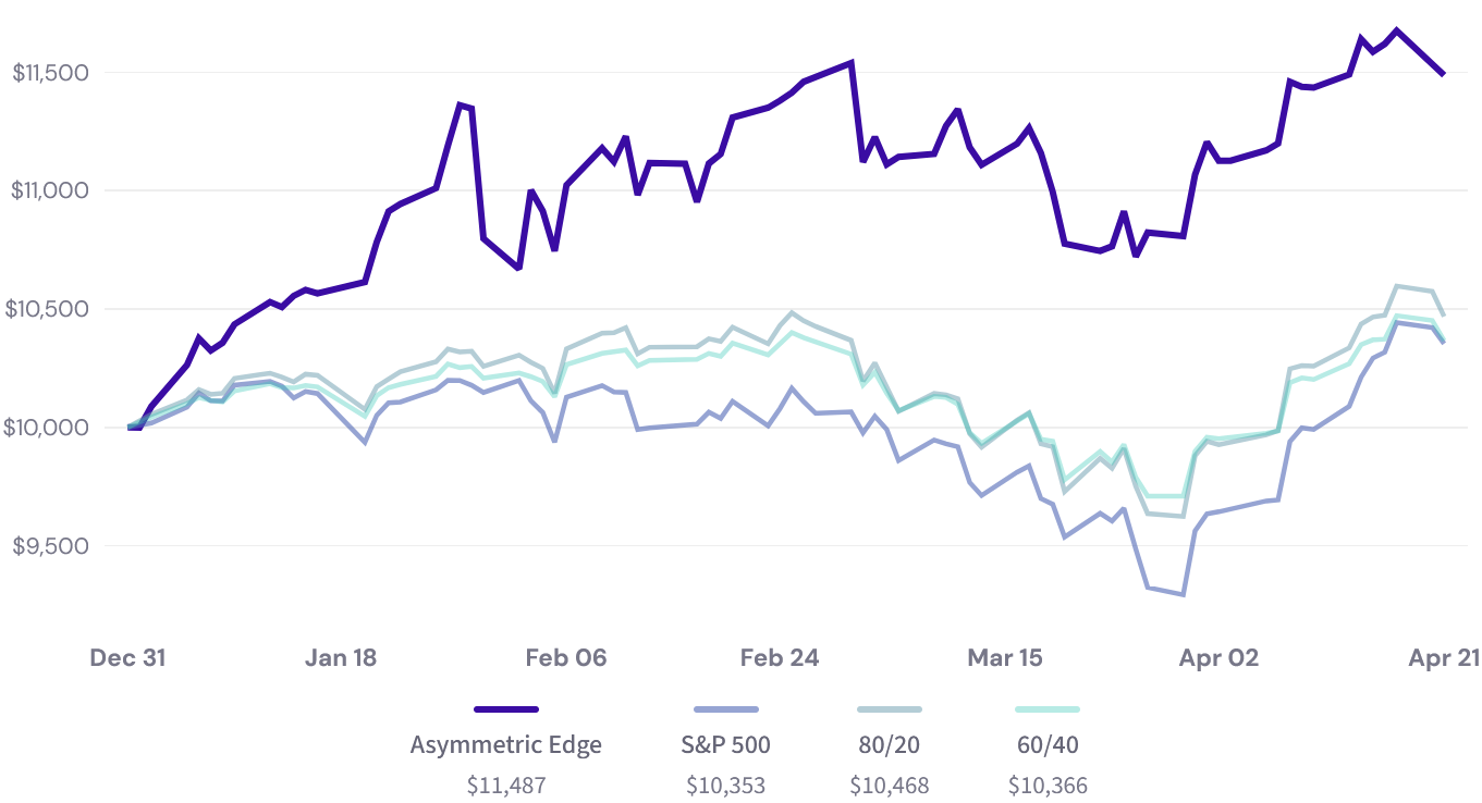 - π Asymmetric Edge up 14.87% YTD, still comfortably ahead of every benchmark despite the S&P 500's April rally narrowing the gap