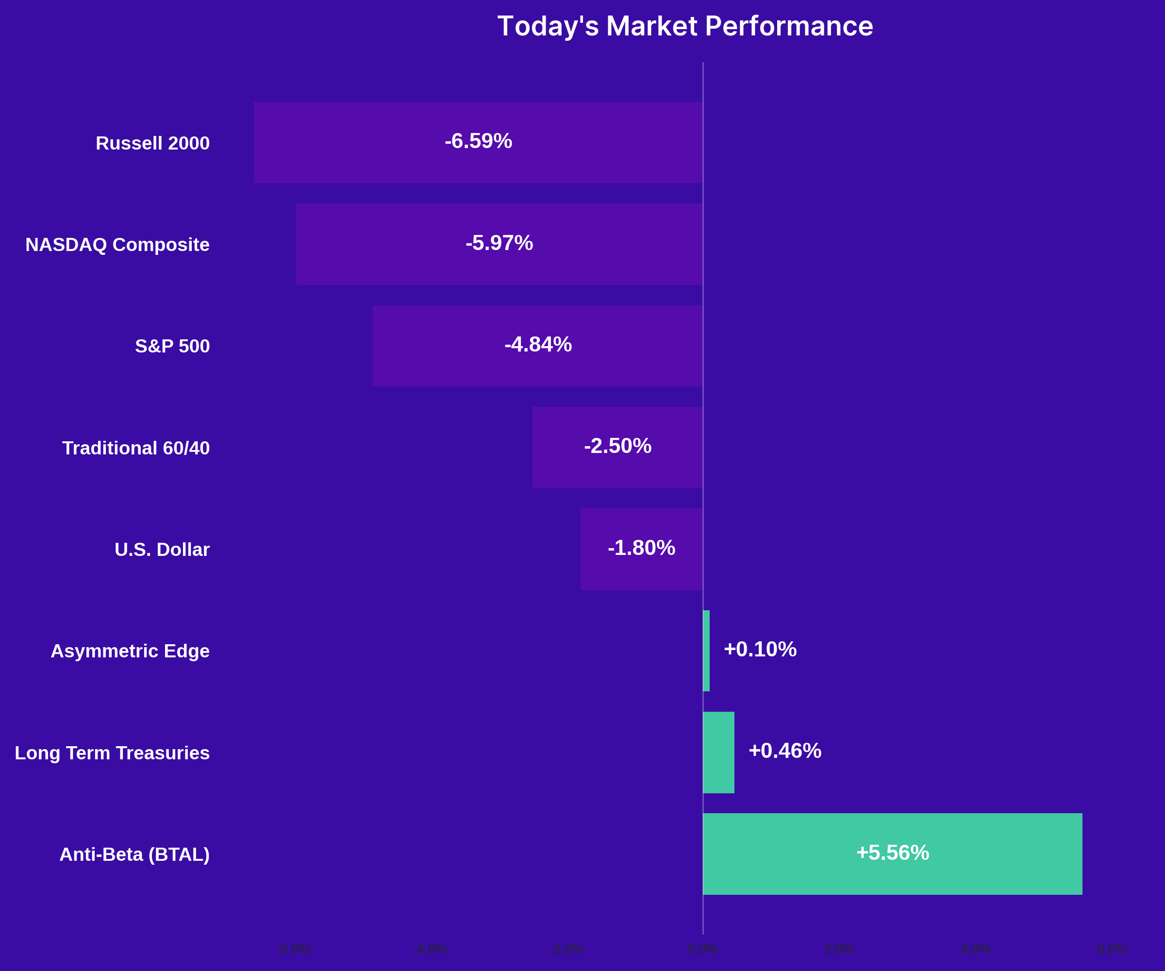 I don't usually send out updates this frequently, but given today's substantial market decline—the worst since the volatility of 2020—I felt compelled to address the current investment landscape and share how Asymmetric Edge's portfolio is holding up. While I wouldn’t claim to have predicted this correction, I’m grateful the strategy was already positioned in more defensive assets to help weather the turbulence. As it turned out, the portfolio even managed to close slightly positive today.