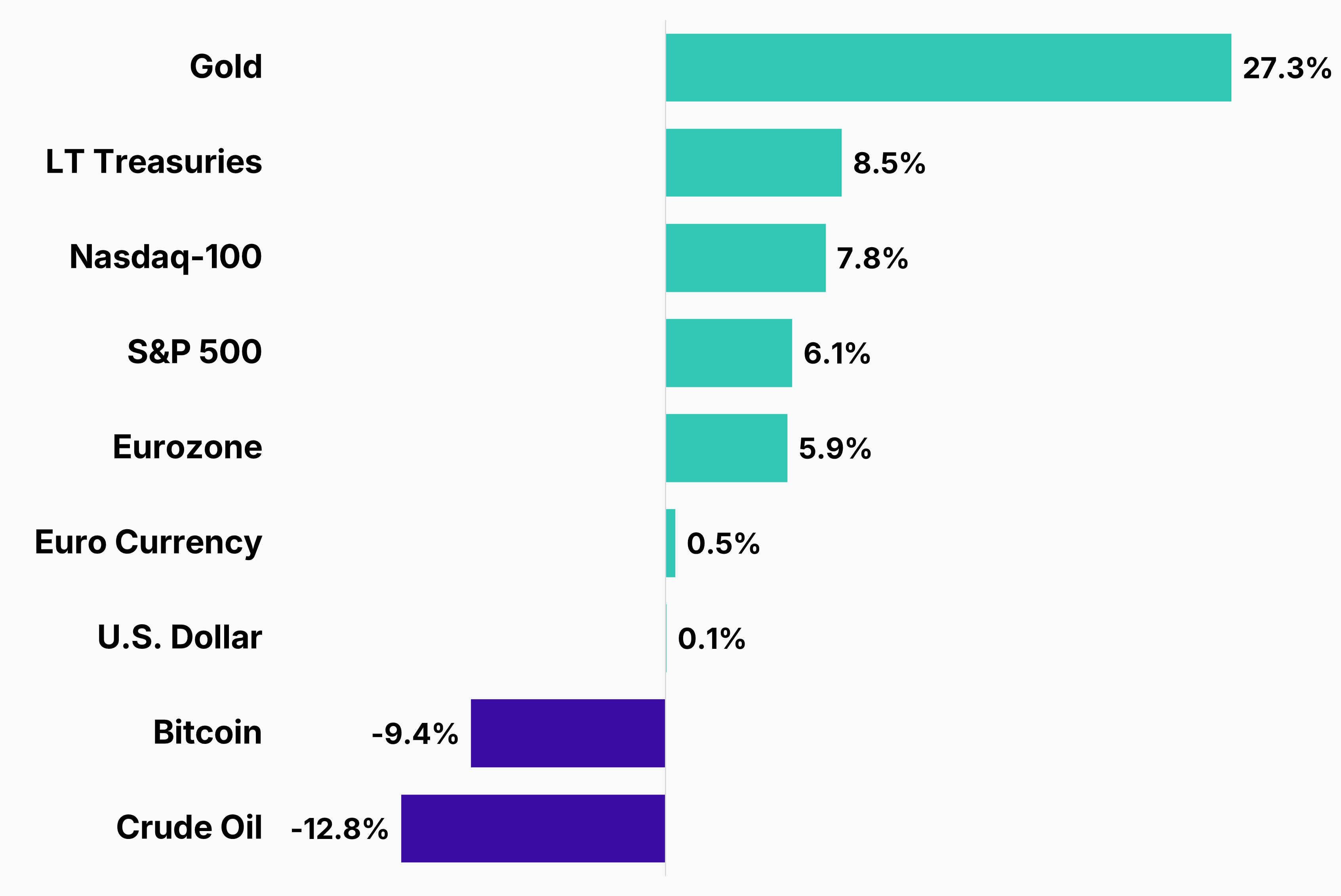 - Monthly rebalance helped capture recent gains in gold and the Nasdaq