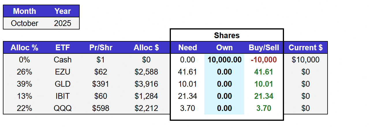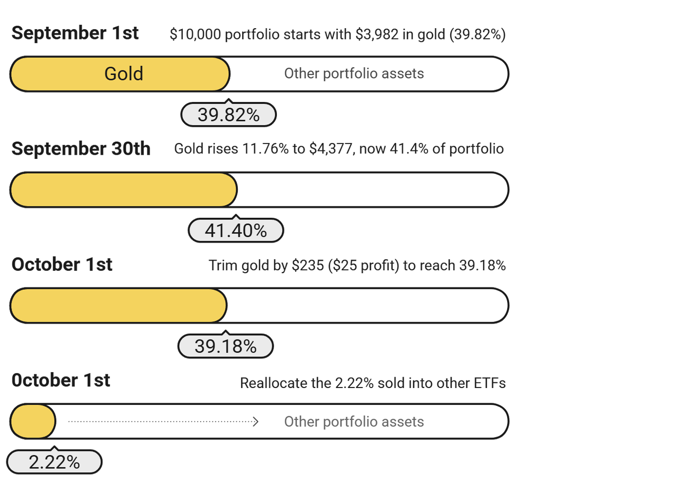October’s rebalancing shows how the strategy steadily locks in gains on portfolio assets which have increased in value during the preceding month. A $10,000 portfolio starting September with $3,982 in gold (39.82%) would see gold rise 11.76% to $4,377 (41.4%). Trimming back to its 39.18% October target allocation means selling $235 worth of gold, realizing $25 in profit, and reallocating that money to other assets, methodically locking in gains on outperformers.
