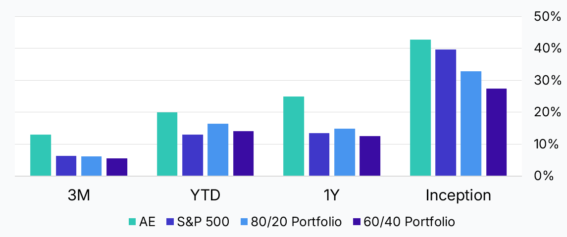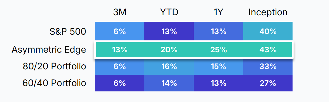The Asymmetric Edge strategy has delivered higher returns than the comparison benchmarks across the periods shown — three months, year-to-date, one year, and since inception in January 2024.