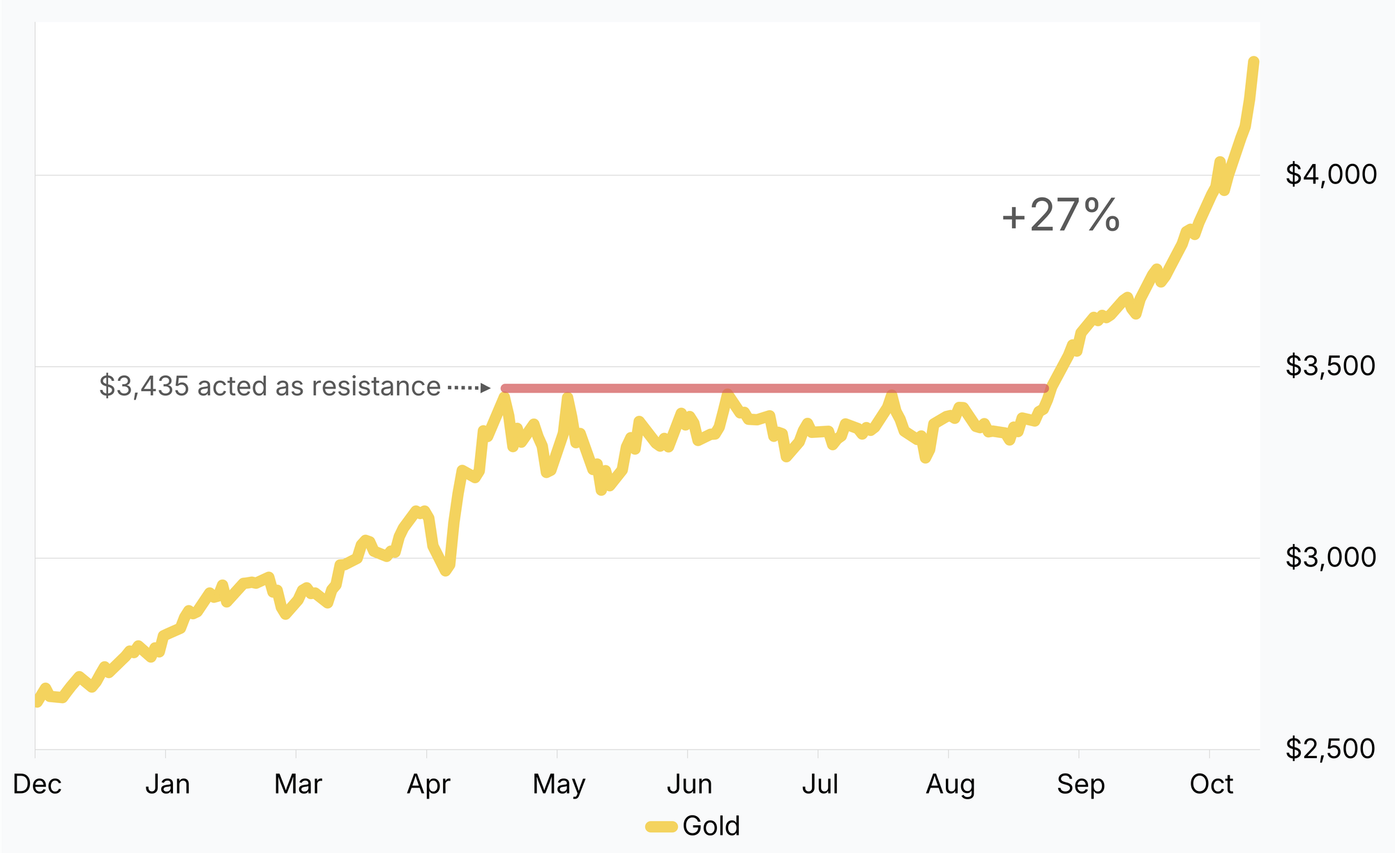 September marked a turning point for gold. After months of consolidation, it broke out and is up over 27% since then. With about 40% of the portfolio in gold recently, it has been the main driver of Asymmetric Edge’s outperformance.