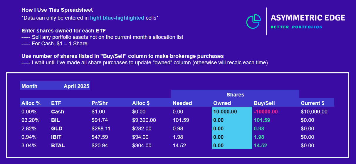 Take a look at my April allocations, below. I've already updated all the allocation changes, and the calculations based on share prices refresh in real time. Simply click the link to use the spreadsheet yourself.