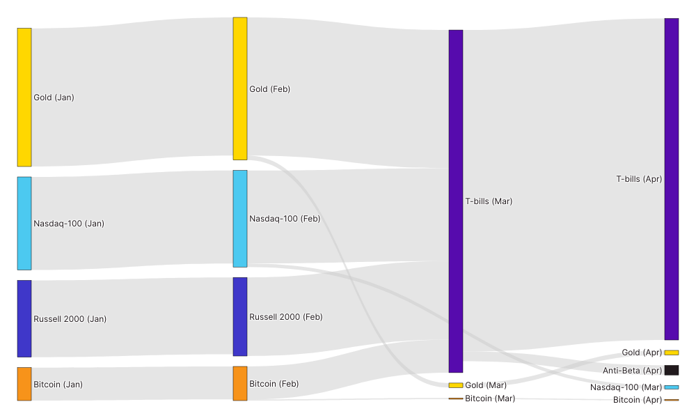 The portfolio stands out due to its adaptability, shifting between aggressive and defensive positions as the market evolves. The Sankey chart above illustrates that in January and February, roughly 60% of assets were allocated to risk-on positions. As market momentum waned, the strategy shifted almost entirely to safe assets like Treasury Bills (BIL).