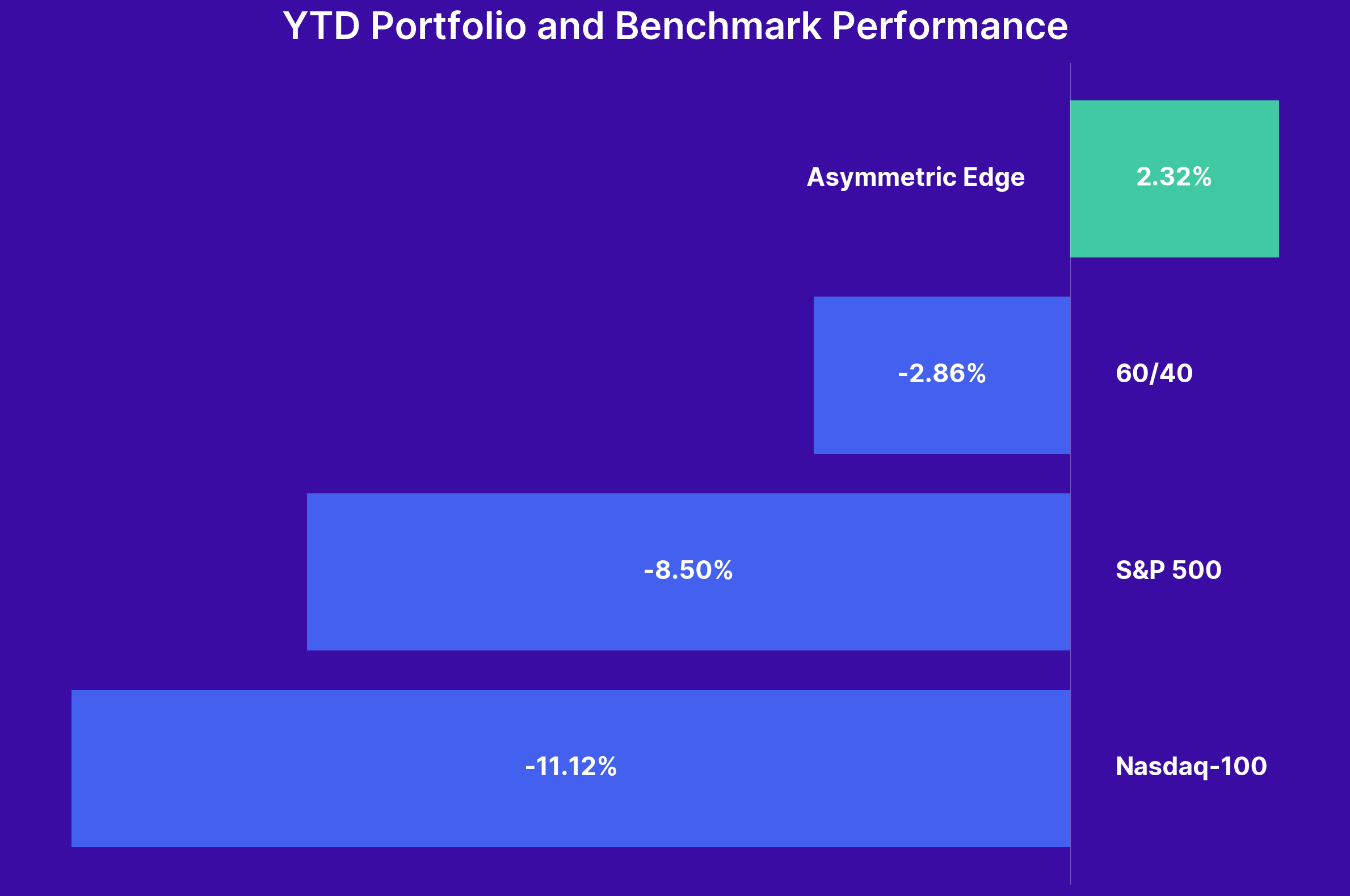 As of April 11, 2025, the Asymmetric Edge portfolio has outperformed traditional benchmarks, beating a 60/40 portfolio by 5.18%, the S&P 500 by 10.82%, and the Nasdaq-100 by 13.44%.